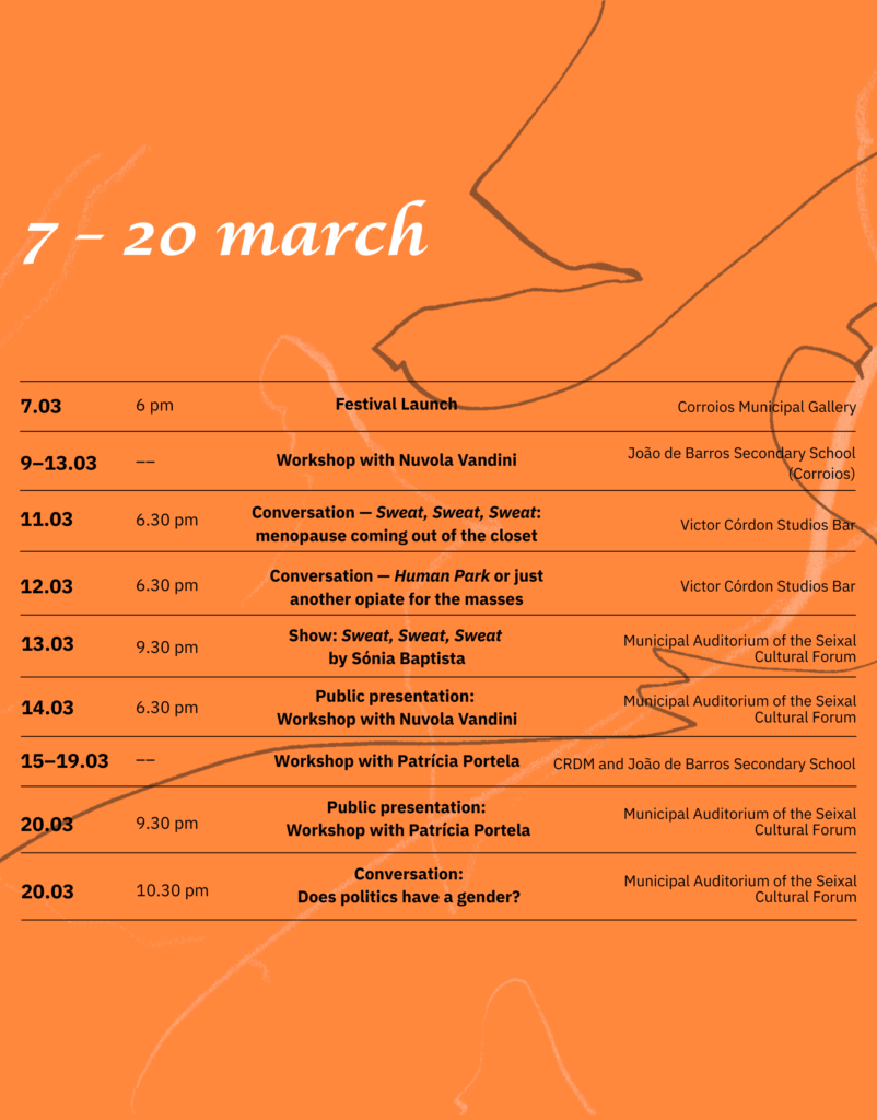 The programme also includes the presentation of Sweat, Sweat, Sweat (a set of small confrontations), by choreographer Sónia Baptista, a work that addresses ageing and the inevitability of the menopause with frankness and humour.